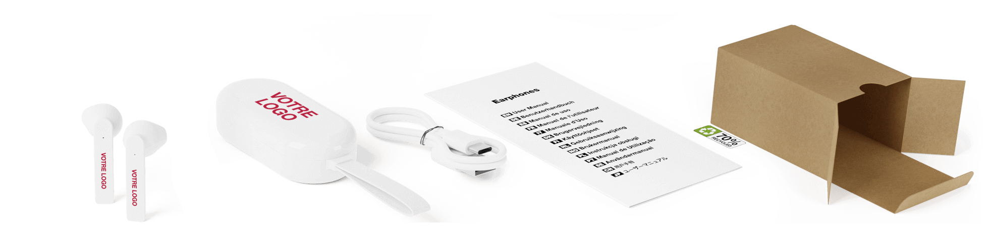 Le nom Bluetooth® est ce que l'utilisateur voit sur son smartphone ou sa tablette lorsqu'il veut connecter le produit audio. Nous pouvons personnaliser ce nom, et ainsi donner une plus grande visibilité au nom de votre société, en renommant le produit avec votre nom ou marque. Si vous ne souhaitez pas bénéficier de ce service, nous afficherons le nom par défaut 'Promo Audio'.Écouteurs Bluetooth® ; entièrement personnalisables
