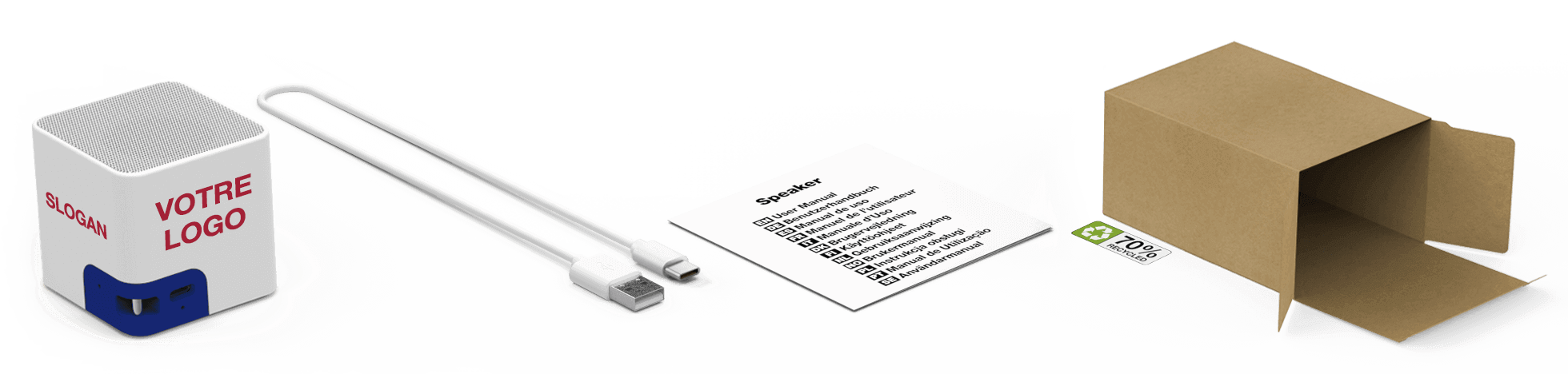 Notre enceinte Bluetooth® Cube est un moyen audacieux de promouvoir votre société. Vous pouvez marquer les 4 côtés du Cube, avec votre logo, slogan, site internet et plus encore! Vous pouvez également notre mousqueton à l'un des coins, qui sont disponibles en 8 couleurs.Le Cube est compatible avec toutes les principales marques de téléphone et de tablettes.