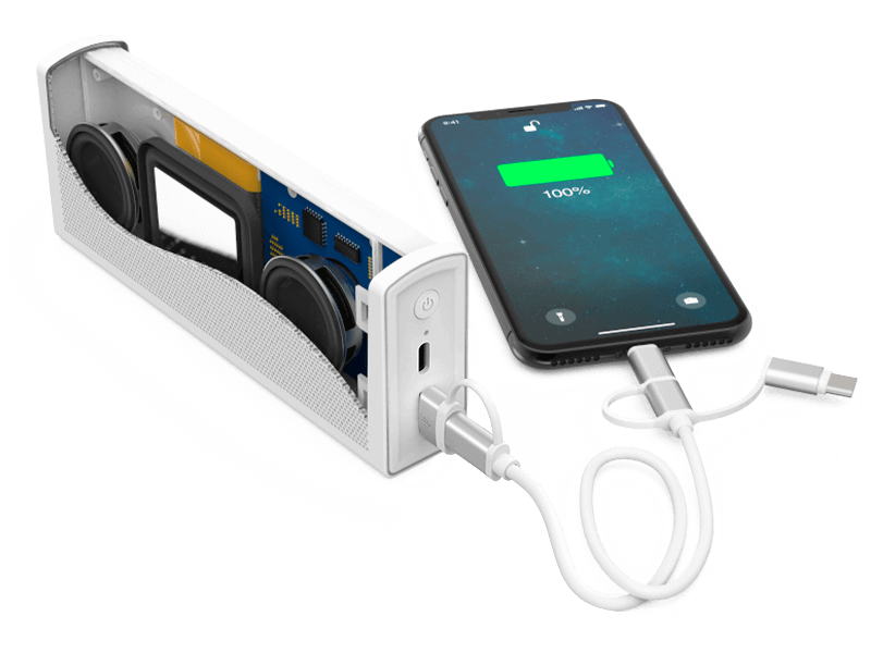 Avec une qualité de son stéréo impressionnante, cette enceinte Bluetooth® ; est bien plus qu'un simple matériel de marketing ! Offrant jusqu'à 10 heures de lecture de haute qualité, un microphone intégré et une fonction de banque d'énergie, c'est aussi un appareil audio de qualité et entièrement fonctionnel que vos clients et consommateurs vont adorer.