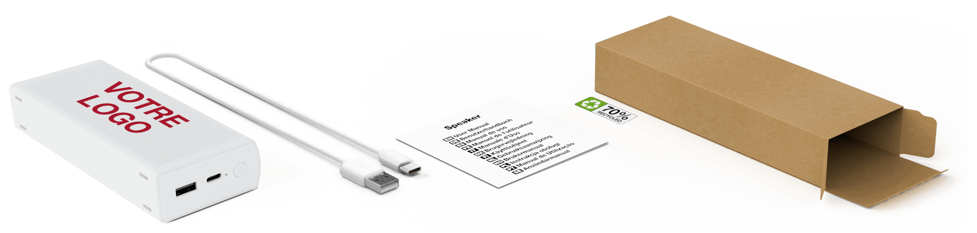 Le nom Bluetooth® est ce que l'utilisateur voit sur son smartphone ou sa tablette lorsqu'il veut connecter le produit audio. Nous pouvons personnaliser ce nom, et ainsi donner une plus grande visibilité au nom de votre société, en renommant le produit avec votre nom ou marque. Si vous ne souhaitez pas bénéficier de ce service, nous afficherons le nom par défaut 'Promo Audio'.Accessoires