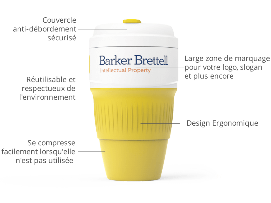 Votre logo, votre slogan et bien d'autres choses encore peuvent être sérigraphiés sur la grande surface d'impression du couvercle. Que la Tasse de voyage soit utilisée ou repliée pour être rangée, votre marque sera bien en vue pour augmenter sa visibilité.